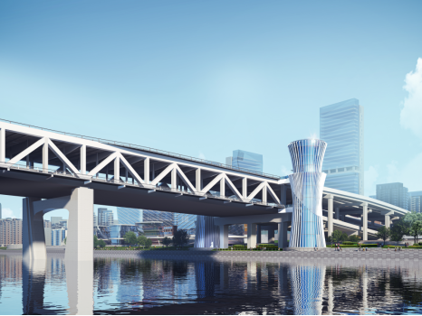 永宁大桥的桥头堡,更是将功能实用性与美学观赏性精妙融合的点睛之笔。北岸45米、南岸57米的设计高度与桥墩形成黄金比例,全玻璃幕墙的圆润造型与周边环境和谐共生。这里不仅是承南启北的交通门户,更集成了垂直交通接驳、景观标识引领、纪念文化传承等多元功能,依托滨江公园资源打造了全国首个空间独立的回字形运动健身场所,以及一侧观日出、一侧赏晚霞的独特观景空间,展现了以人为本的设计理念。