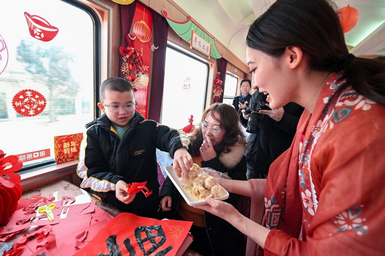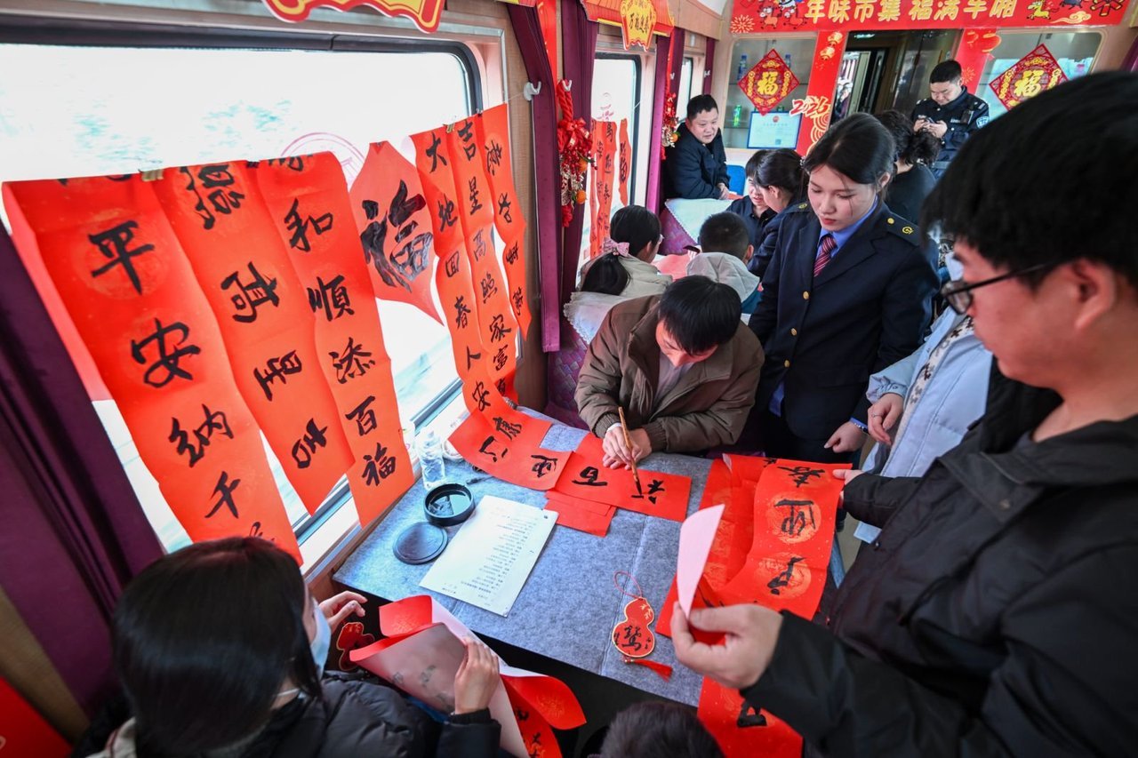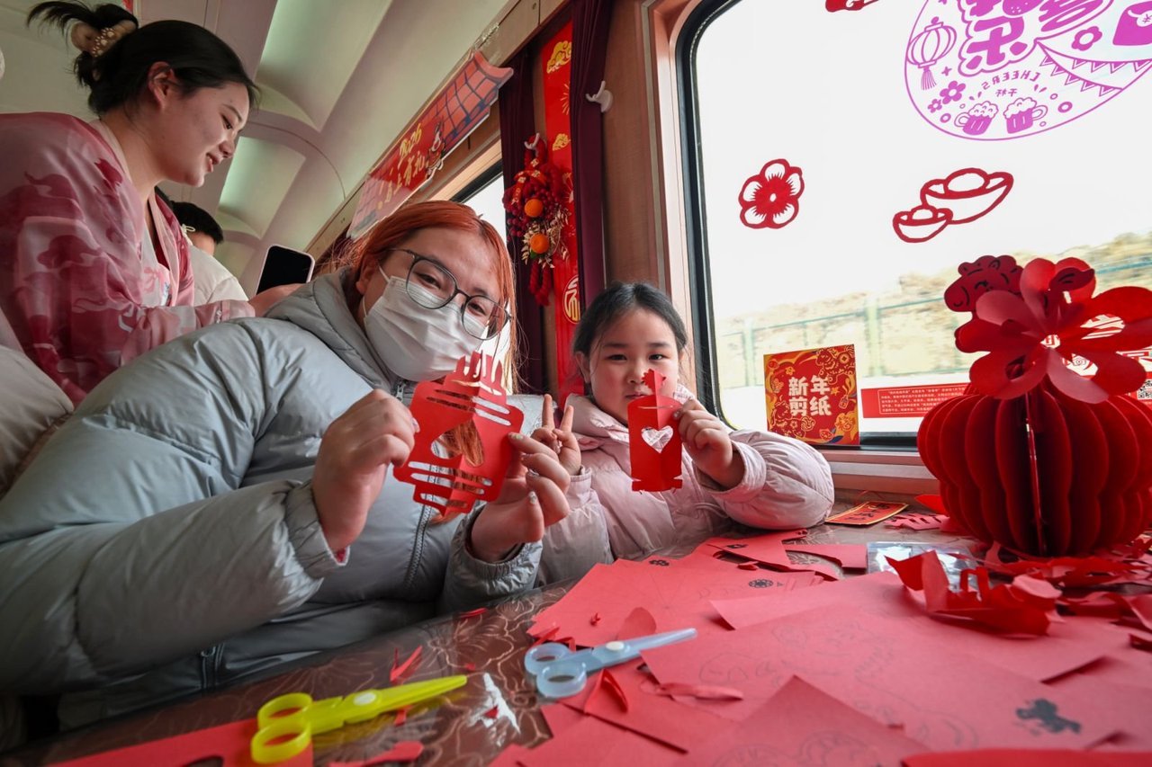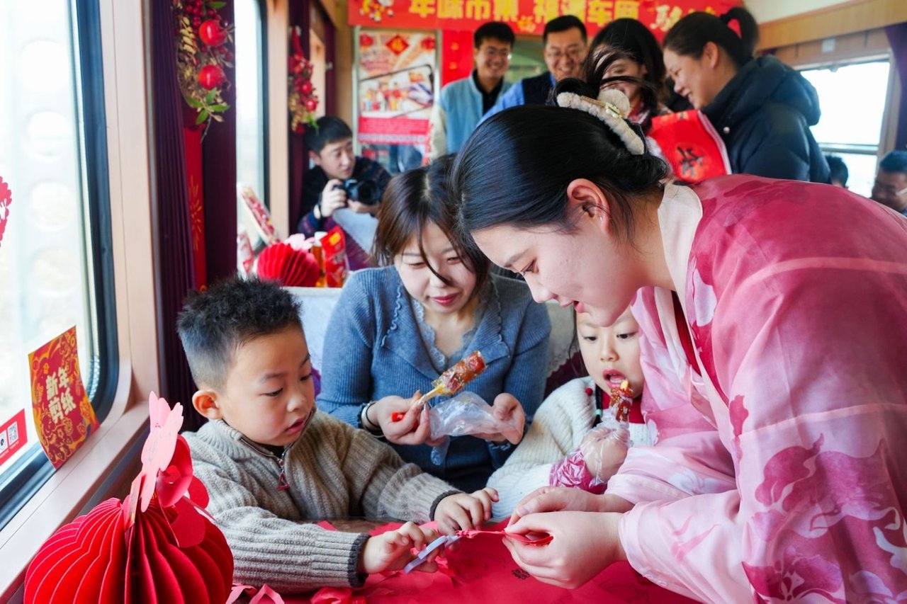 “二十三,糖瓜粘!”乘务员一边向旅客分发灶糖、糖葫芦,一边讲解小年习俗。车厢内,剪纸非遗体验区围满了大人小孩,一张红纸、一把剪刀,在工作人员指导下,一只只“福马”“春燕”跃然掌中;“马上有礼”互动问答妙趣横生,答对即可领取新春好礼;心愿卡前,旅客们提笔写下“阖家安康”“事业腾达”的新年愿望,并与“年味背景墙”合影留念,欢声笑语洋溢整个车厢。