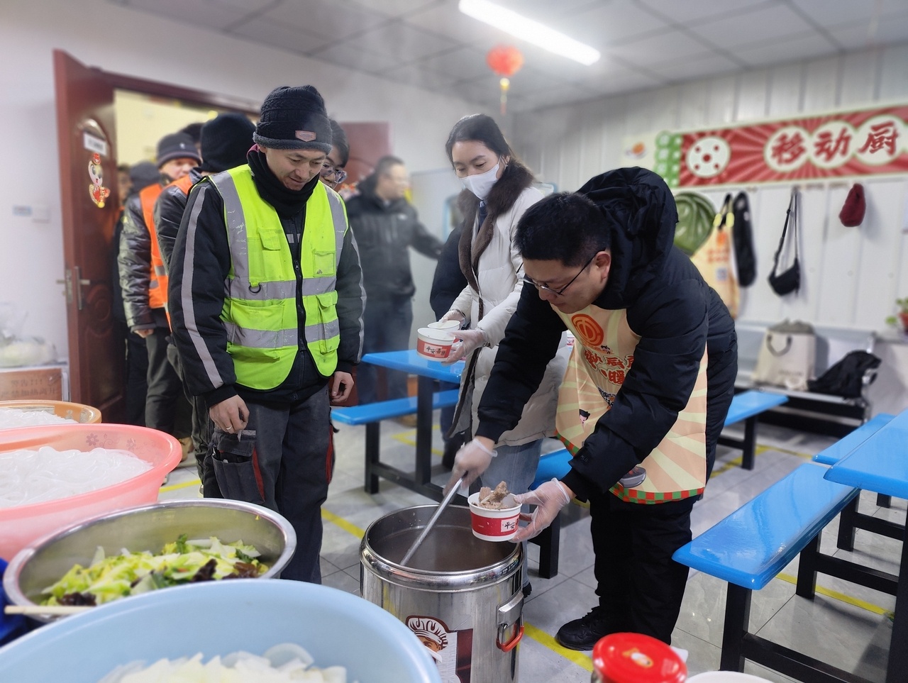 “大家辛苦了!这碗热饭,是感谢,更是敬意!”李龙为刚下流水线的员工端碗盛饭,围坐一起拉家常、问冷暖。他详细了解防寒保暖、轮班休息等情况,反复叮嘱:“效率要保,安全更要保;有困难,随时找工会!”