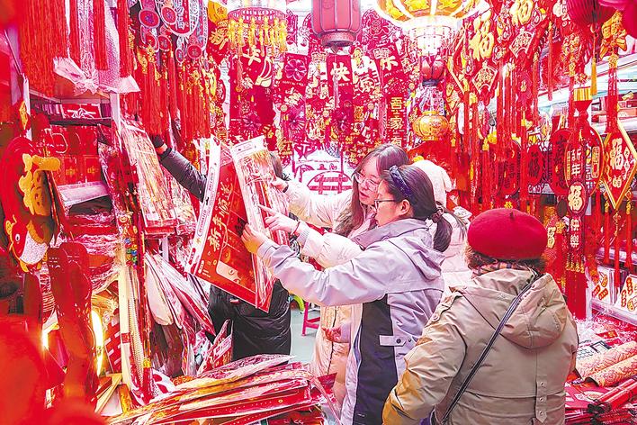 2月1日,走进黄石市西塞山区上窑商贸城,沿街商铺挂满大红灯笼、中国结、窗花等传统新春饰品,空气中弥漫着炒货的焦香与糖果的甜香,市民穿梭其中置办年货,年轻人则在“上窑记忆”和平街特色商业街拍照打卡,传统采购的热闹与新潮体验的悠闲在此交融。