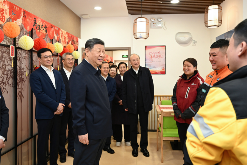 2月9日至10日,中共中央总书记、国家主席、中央军委主席习近平在北京考察并看望慰问基层干部群众。这是10日上午,习近平在西城区新街口街道父母食堂考察时,同在这里休息的快递小哥亲切交流。新华社记者 谢环驰 摄