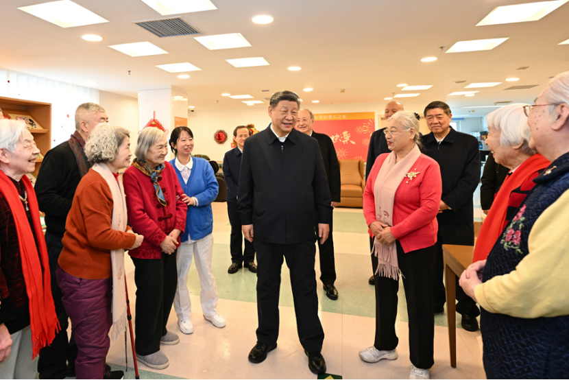 在银龄老年公寓,习近平详细了解老年人健康检查、康复训练、日常起居照料等情况。大厅里,一些老人正在写春联和福字,习近平来到他们中间,欣赏他们的创作,勉励他们老骥伏枥、老有所为,祝他们健康长寿、春节快乐。