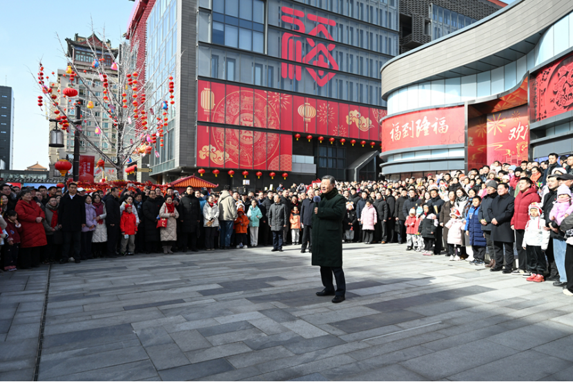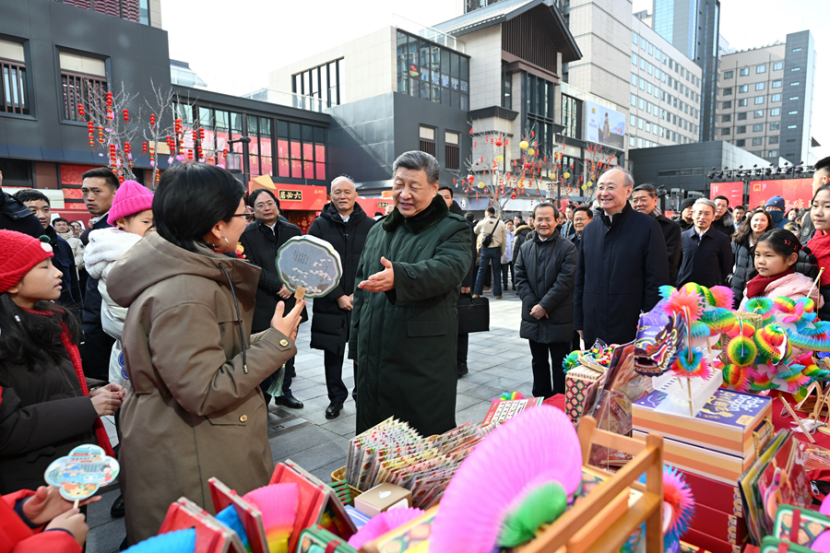 正值农历小年,隆福大厦前,新春市集吸引了大量市民和游客。习近平饶有兴致察看各式年货摊位,同现场群众亲切交流。他愉快地向大家讲起年少时多次到隆福寺的情景,还购买了几份特色食品和文创产品。
