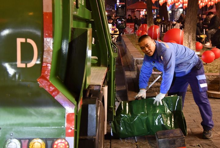 2月4日,在簋街清运多年的李宁,装运完垃圾后清理环境。新华每日电讯记者 李欣 摄