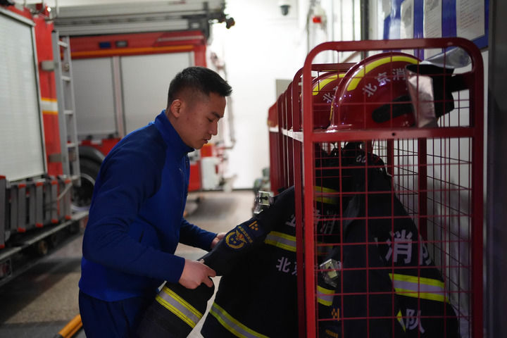 2月3日,一名消防员对消防防护装备进行检查。新华每日电讯记者 谢晗 摄