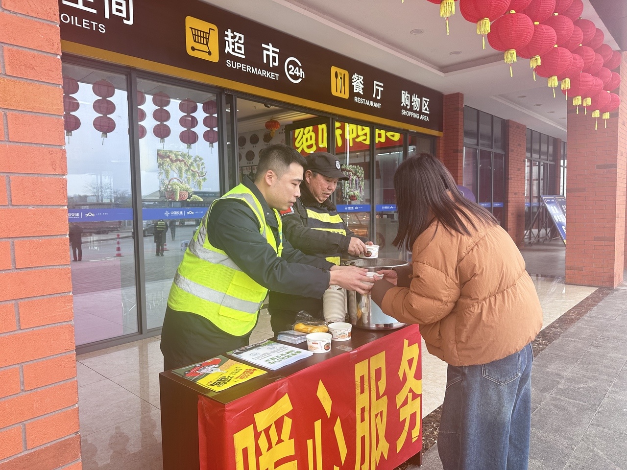 当天上午,服务区工作人员早早支起姜汤熬制点,将生姜、红枣、红糖等食材精心熬制成热气腾腾的姜汤,免费送到货车司机、自驾旅客、返乡务工人员手中。“跑了大半天高速,喝上这杯热姜汤,身子暖了,心里也跟着暖了!”一位长途货车司机接过姜汤,连声道谢。针对带着孩子的家庭、老年旅客等特殊群体,服务区的工作人员主动上前帮扶,引导休息如厕、递上热饮,细致入微的服务让旅客们倍感贴心。