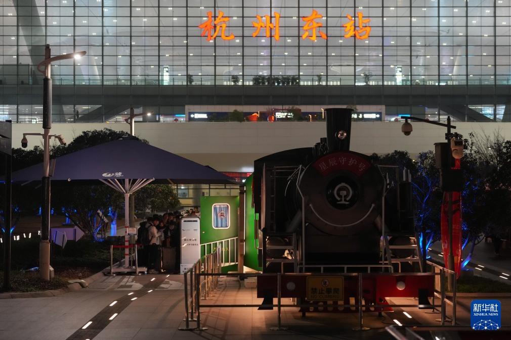 夜幕下的杭州东站东广场,四节复古绿皮车厢亮起暖黄色灯光,成为迎候夜间出行旅客落脚休息的一片“暖心港湾”。