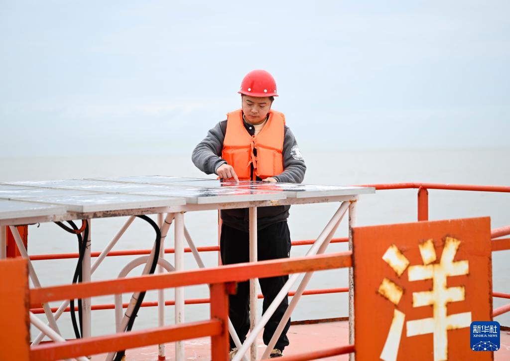 2月10日,王德旺在灯船上检修太阳能电池板。新华社记者 陈浩明 摄