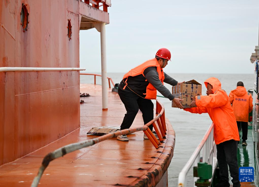 2月10日,高级工程师王德旺(左)在船员的协助下往灯船上搬运检修设备。新华社记者 陈浩明 摄