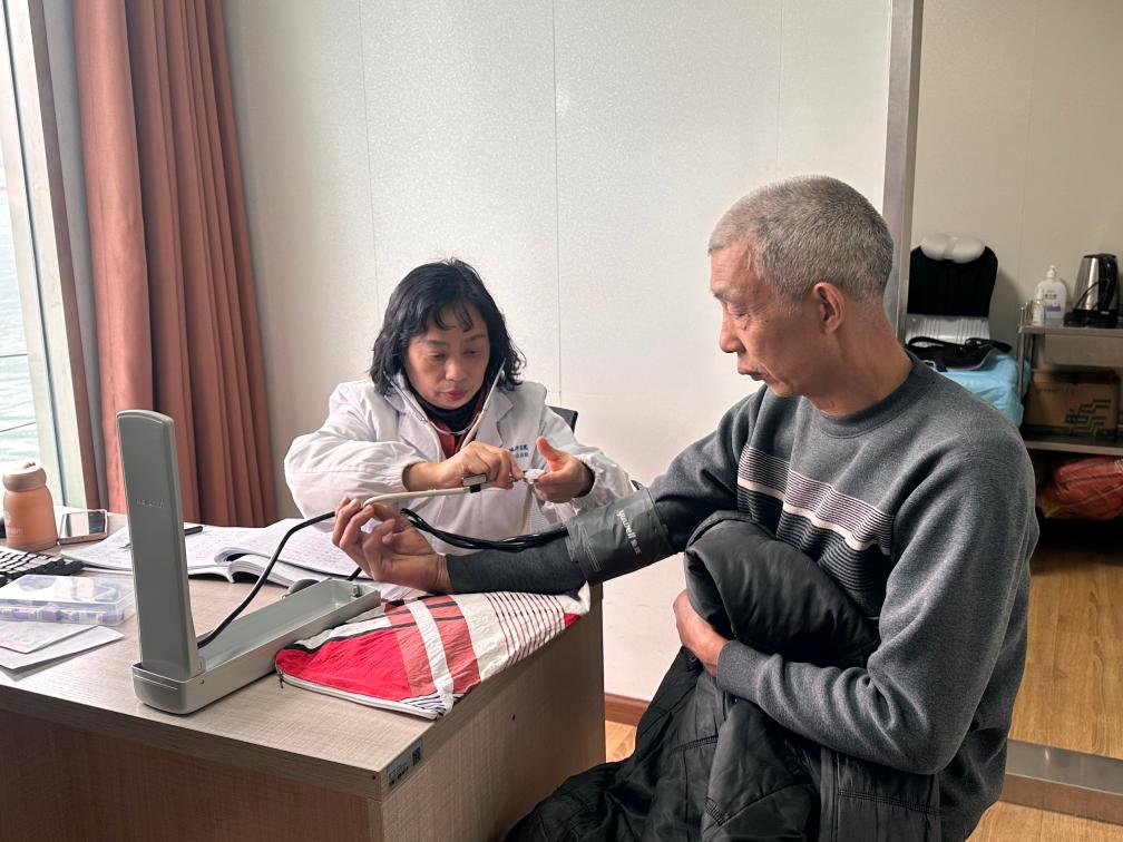 船医给船员测量血压。新华社记者戴锦镕 摄