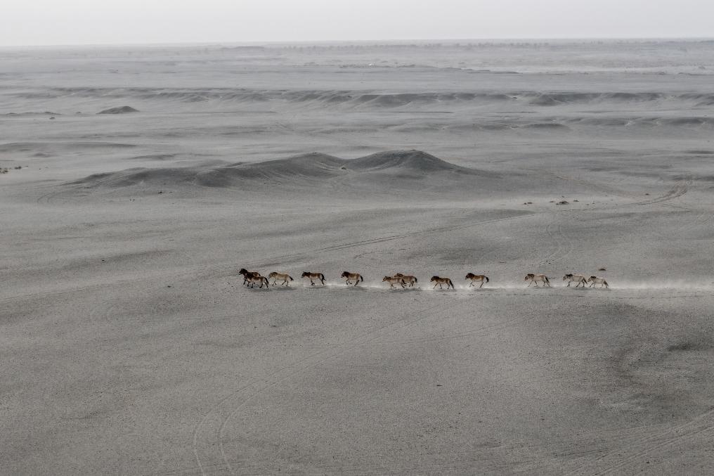 一群普氏野马在甘肃敦煌西湖国家级自然保护区的戈壁荒漠上奔跑(无人机照片)。新华社记者郎兵兵 摄