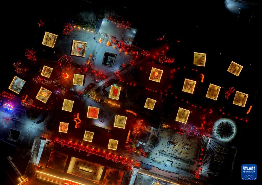 2月12日,游客在第九届陕州灯会现场赏灯(无人机照片)。新华社记者 李嘉南 摄
