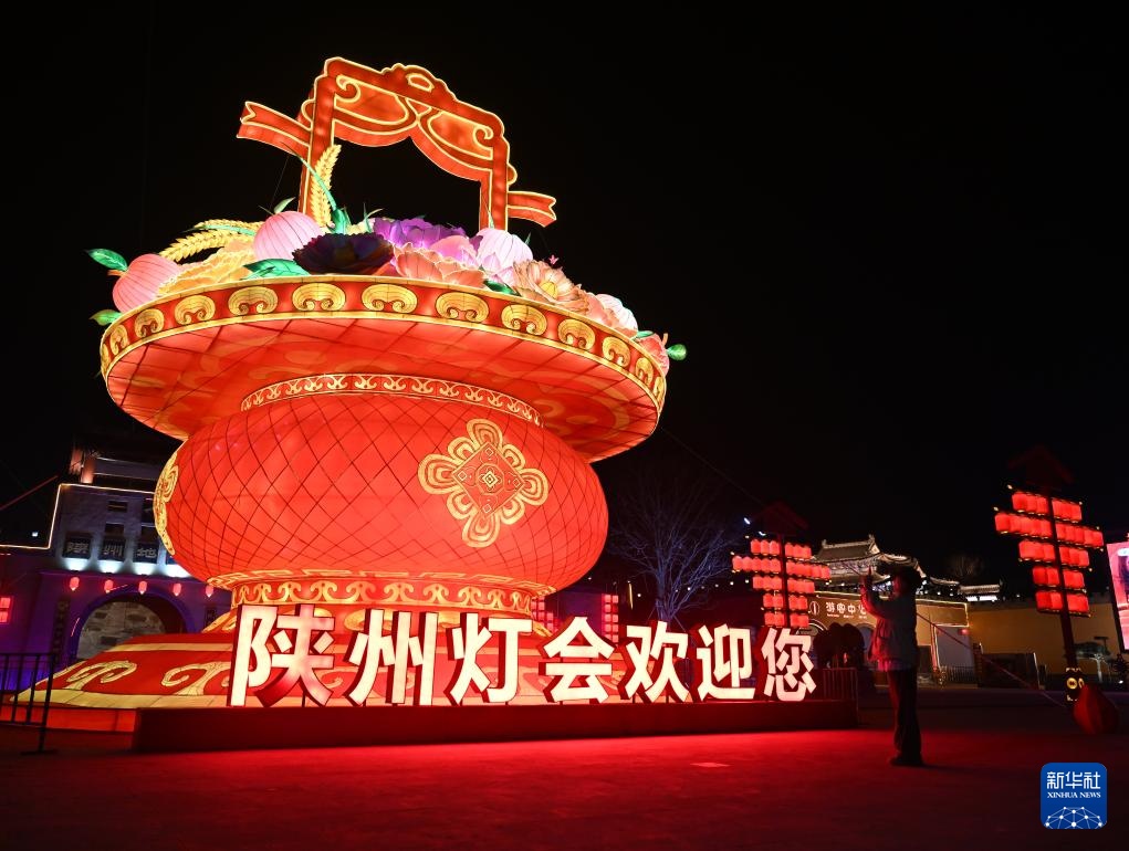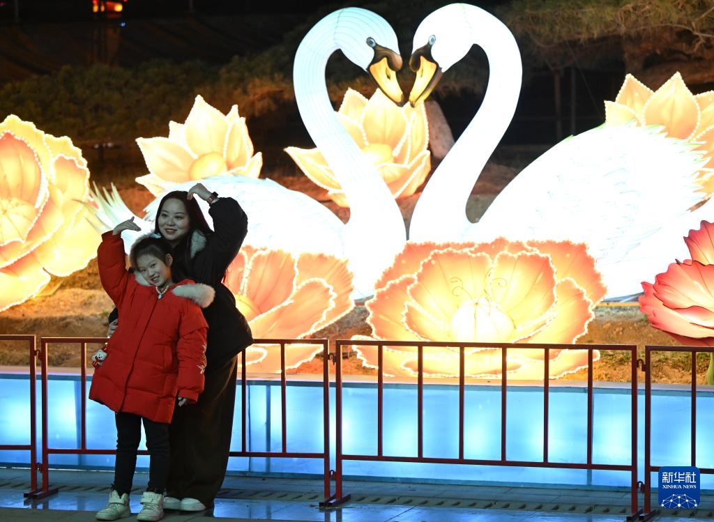 2月12日,游客在第九届陕州灯会现场赏灯拍照。新华社记者 李嘉南 摄