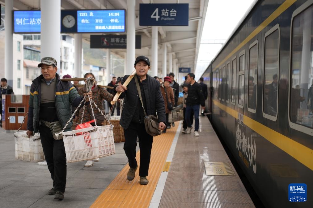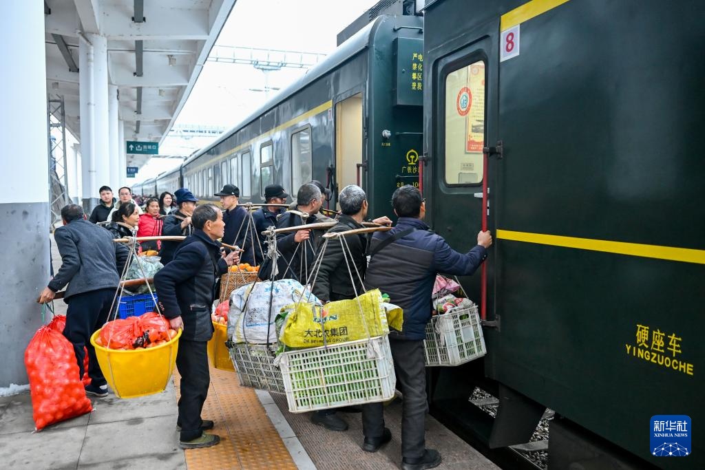 2月12日,村民挑着新鲜果蔬准备搭乘7272次公益性“慢火车”前往贵州铜仁。新华社记者 刘续 摄