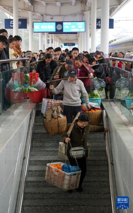 2月12日,在贵州省铜仁市铜仁火车站,村民挑着蔬果出站。新华社记者 刘续 摄