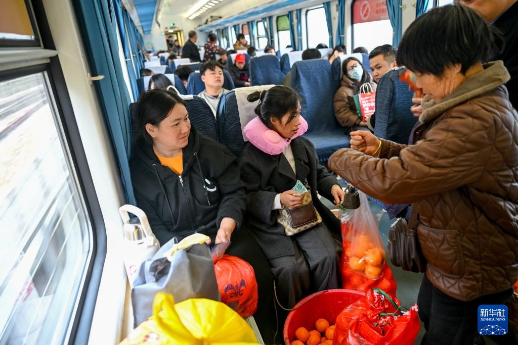 2月12日,在7272次列车车厢内,来自湖南的村民(右)和乘客进行交易。新华社记者 刘续 摄
