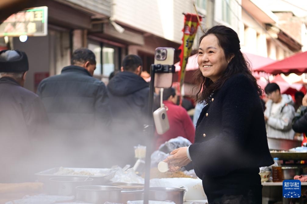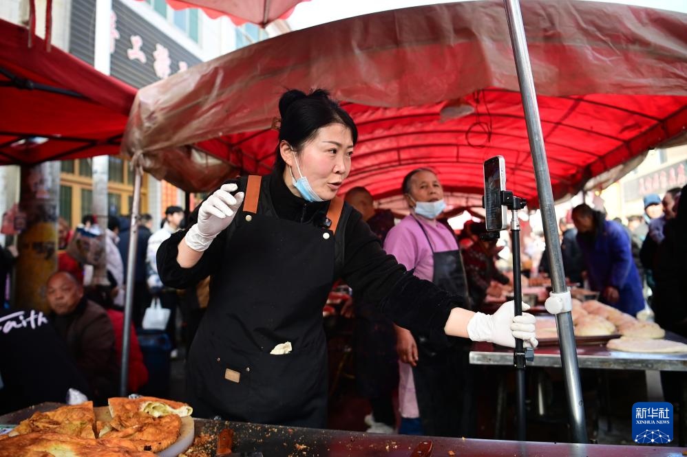2月13日,一名摊主在焦岱大集上做直播。新华社记者 邹竞一 摄