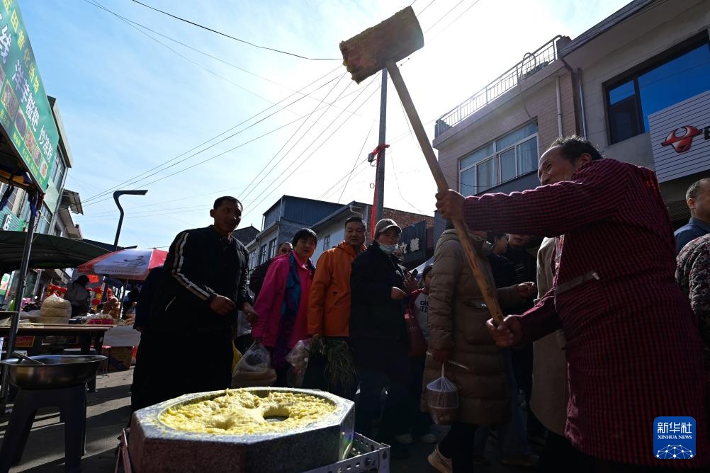 2月13日,游客在焦岱大集上观看糍粑制作。新华社记者 邹竞一 摄