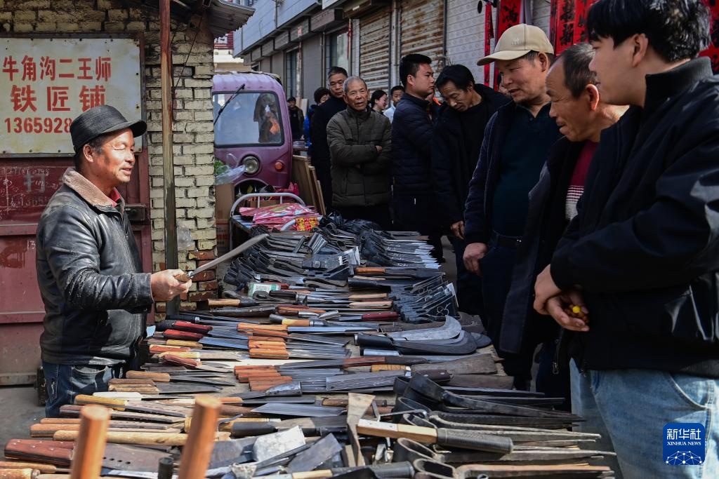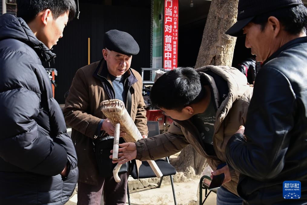2月13日,当地手工艺人李学员(左二)在焦岱大集上向顾客介绍自制的手工凳子。新华社记者 邹竞一 摄