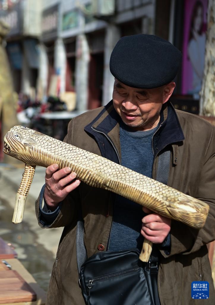 2月13日,当地手工艺人李学员在焦岱大集上查看自制的手工凳子。新华社记者 邹竞一 摄