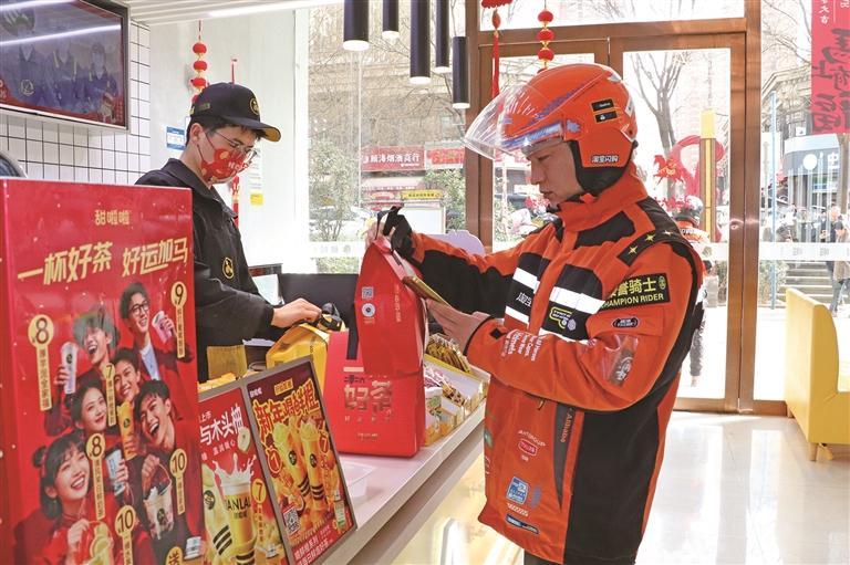 2月11日,冯天雷在大明宫万达广场一店内取外卖。