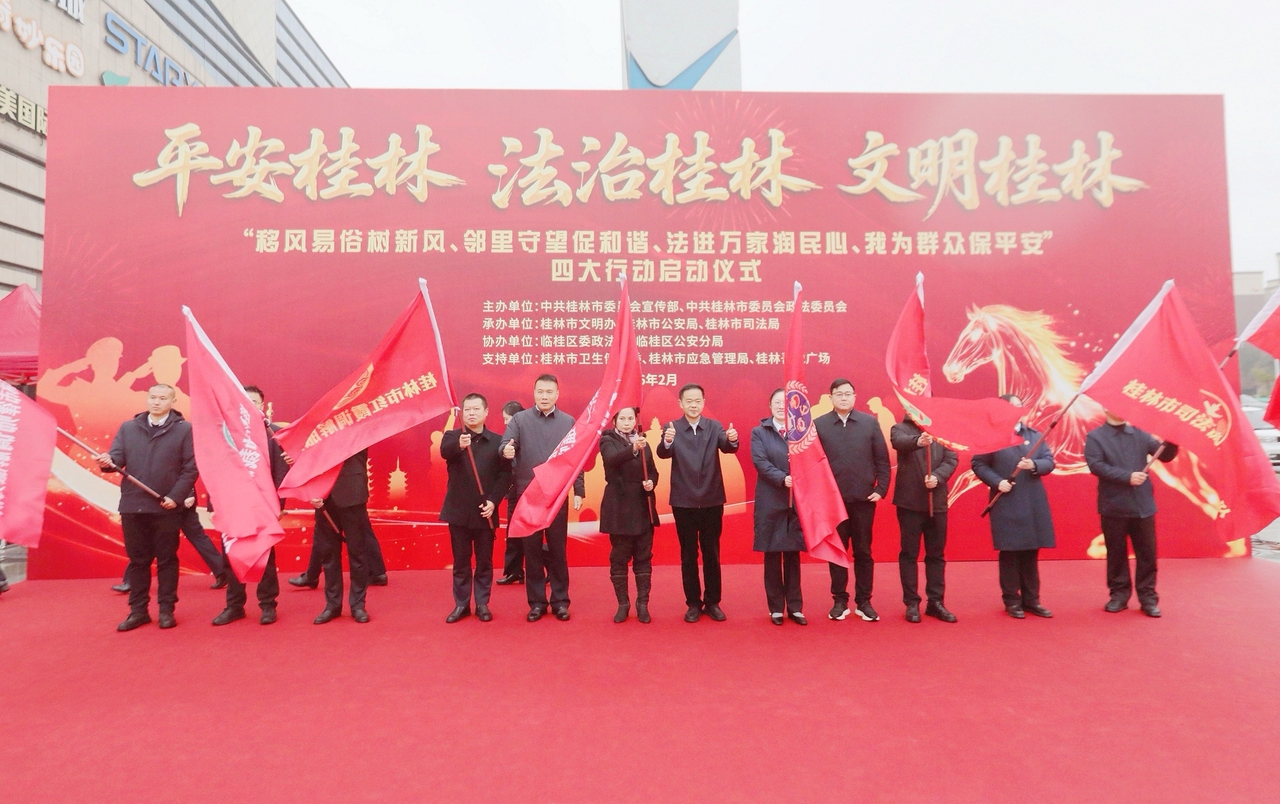 2月10日,一场以“平安桂林 法治桂林 文明桂林”为主题的新春系列行动启动仪式在广西桂林市临桂区吾悦广场启幕。