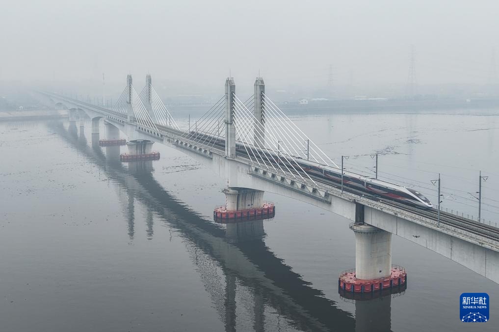 2月14日,列车在金建高铁兰江特大桥上行驶(无人机照片)。新华社记者 黄宗治 摄