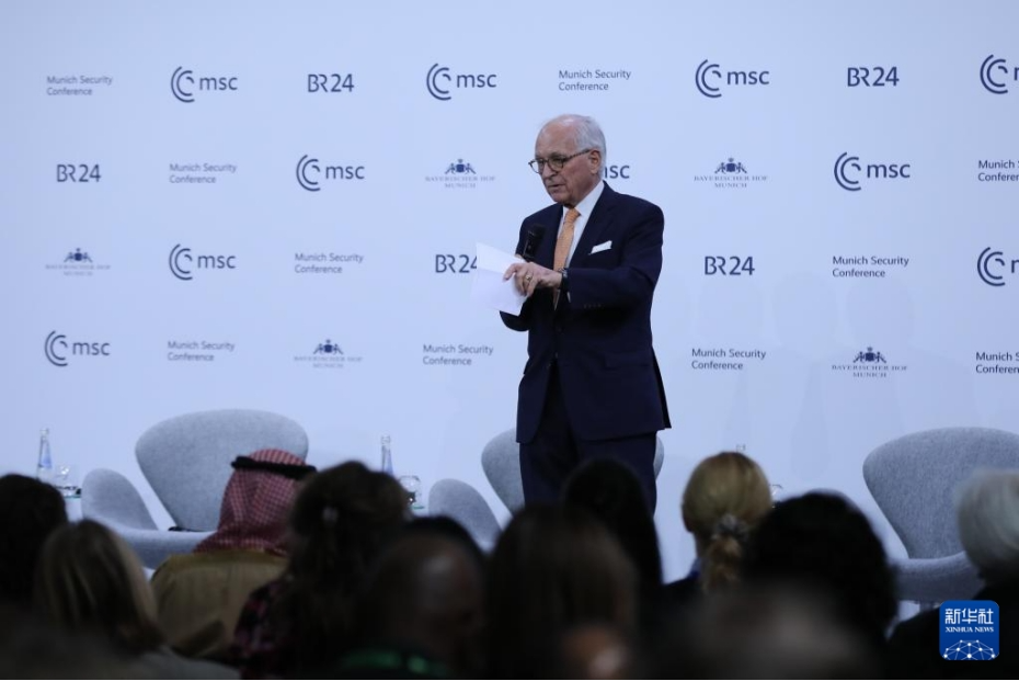 2月15日,在德国慕尼黑,慕安会主席沃尔夫冈·伊申格尔在闭幕式上致辞。新华社记者 杜哲宇 摄