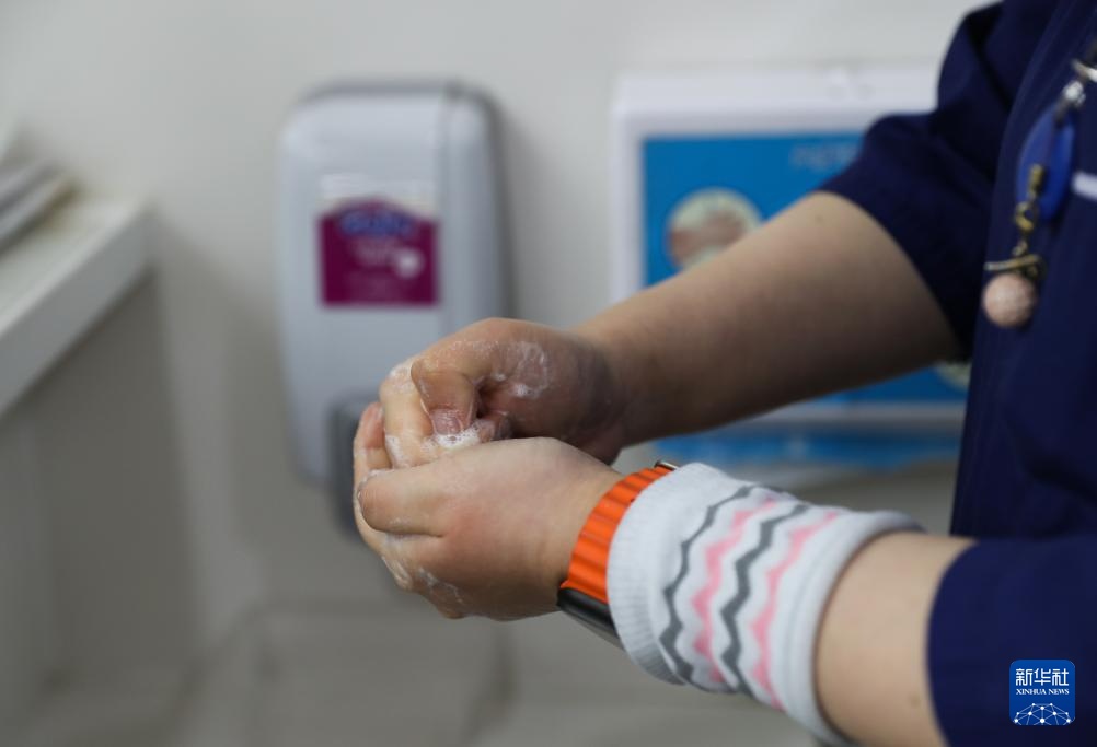 2月4日0点41分,护士接触病患后用七步洗手法洗手。新华社记者 王婧嫱 摄