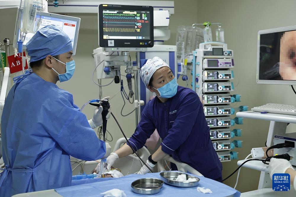 2月12日11时许,医护人员在重症监护室为一名患者进行支气管镜检查。新华社记者 张玉薇 摄