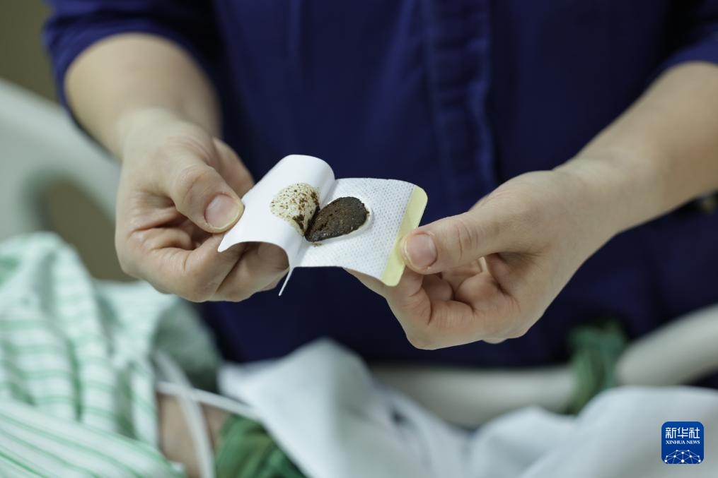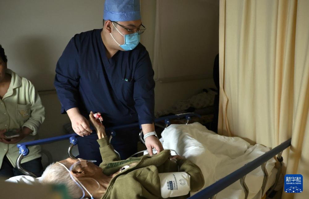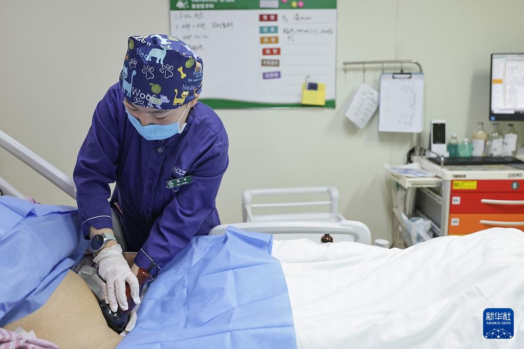 2月12日11时许,一名护士在重症监护室为一名患者进行电热砭石技术操作。新华社记者 张玉薇 摄