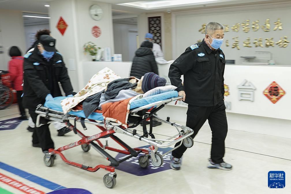 2月12日12时许,120急救人员在急诊大厅转运一名患者。新华社记者 张玉薇 摄
