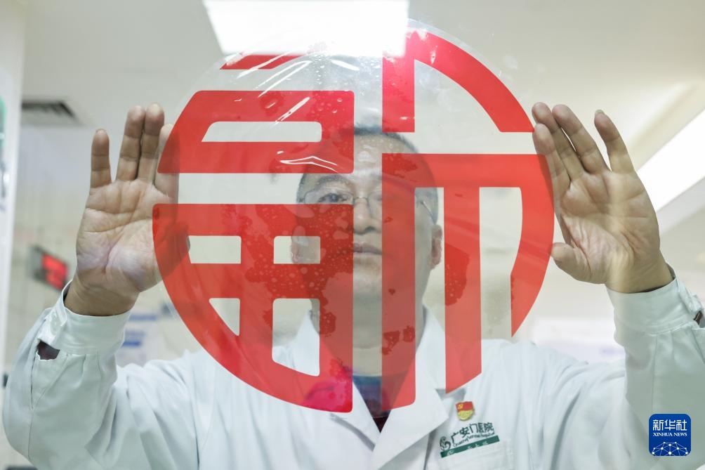 2月12日16时许,急诊科主任于大兴在急诊病房内贴上福字。新华社记者 张玉薇 摄