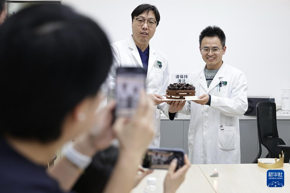 2月5日19时许,两位急诊科医生在休息室内庆祝生日。新华社记者 张玉薇 摄