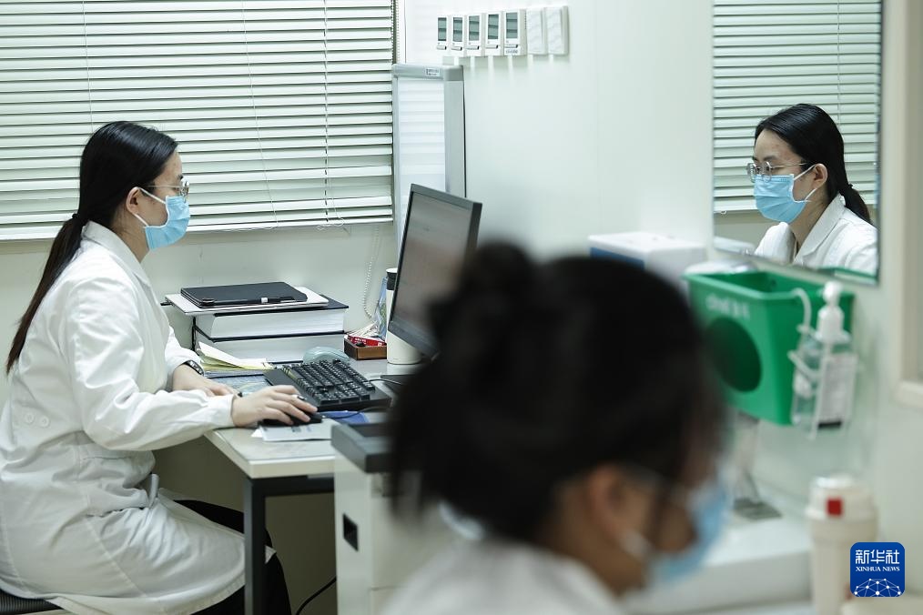 2月9日9时许,急诊科主治医师李琼(右)与学生在办公室进行业务交流。新华社记者 石枫 摄