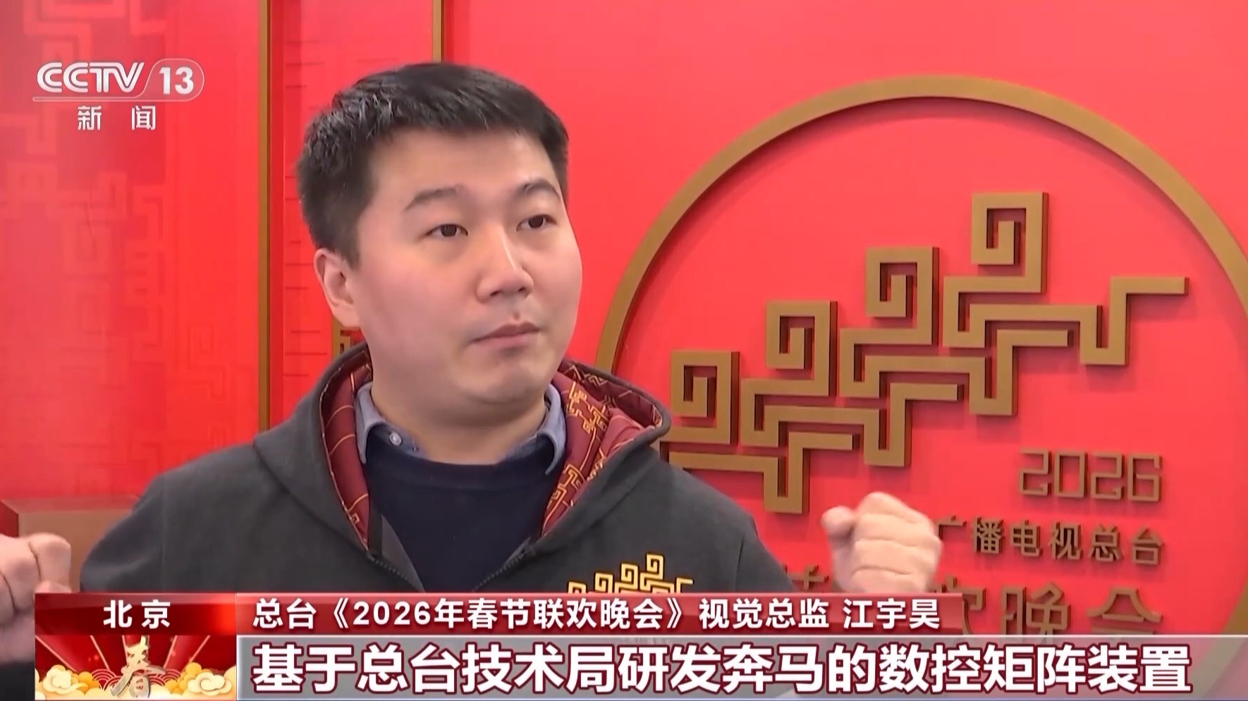 总台《2026年春节联欢晚会》视觉总监 江宇昊:基于总台技术局研发奔马的数控矩阵装置,它是由300多块模组,5584块单块翻转模块来构成的整个8匹奔腾的奔马的一个艺术装置。