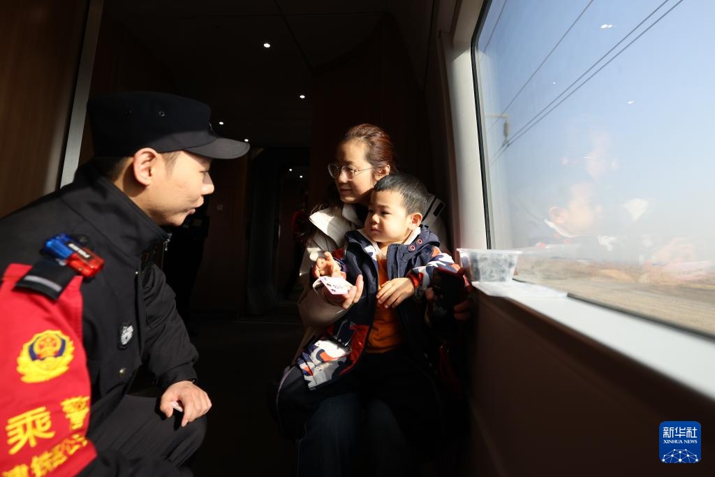 在G679次列车上,乘警马键巡车检查时给抱有小朋友的旅客叮嘱安全注意事项(2月12日摄)。新华社记者 孙凡越 摄