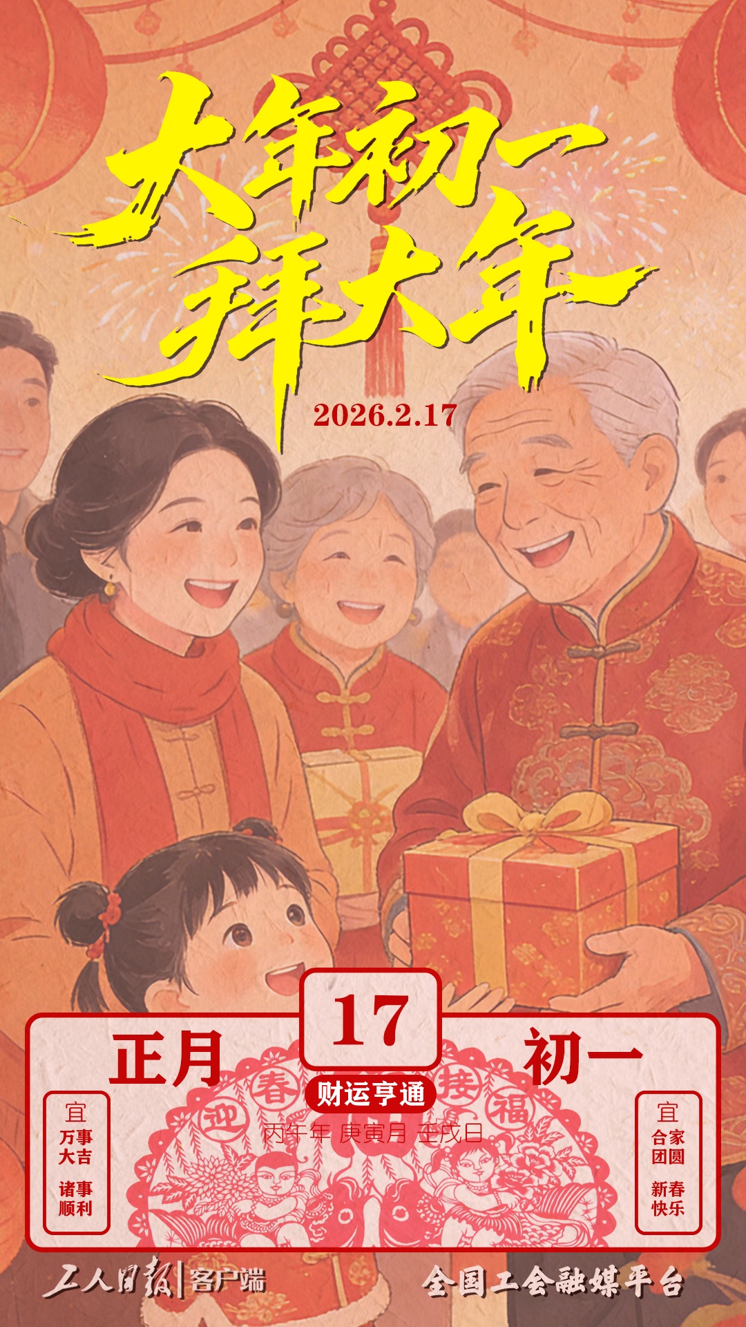 今日晨起先“开财门”,迎五路财神;再着新衣,向长辈行拜年礼,讨个“压岁钱”的彩头。我们给您全家拜年!愿您在丙午马年:一顺百顺,龙马精神!借着初一的喜气,祝您新的一年,烟火向星辰,所愿皆成真。多喜乐,长安宁,岁岁年年,万事胜意!