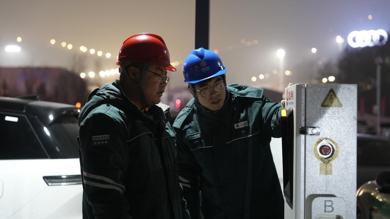 吉林供电公司北大湖供电所李泓申和富群敬在停车场检查电动汽车充电桩