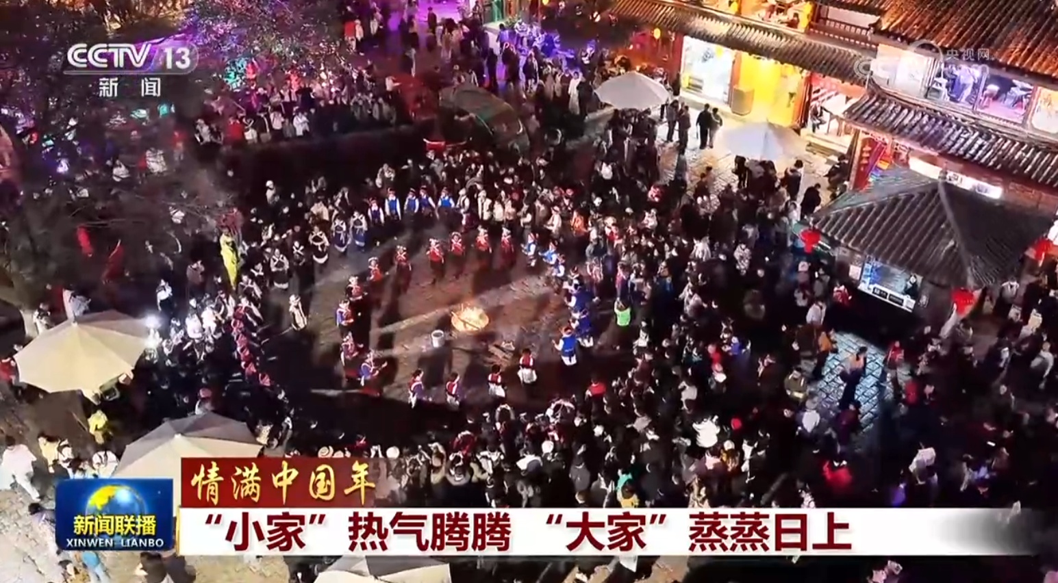 河山添锦绣,情满中国年。城市乡村张灯结彩、喜庆祥和,家家户户辞旧迎新、开心快乐。在铿锵的鼓乐声中,在精彩的展演中,人们礼赞幸福生活,许下美好心愿。团圆时刻,一个个“小家”的热气腾腾,映照着祖国“大家”的蒸蒸日上。