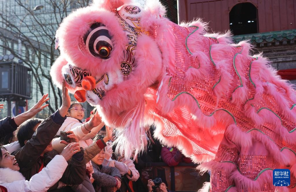 2月17日,游客在观看东岳庙庙会中的狮舞演出。新华社记者 陈钟昊 摄