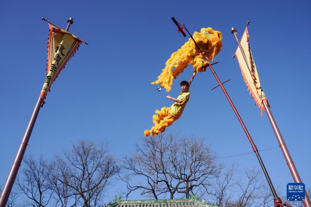 2月17日拍摄的东岳庙庙会中的狮舞演出。新华社记者 陈钟昊 摄