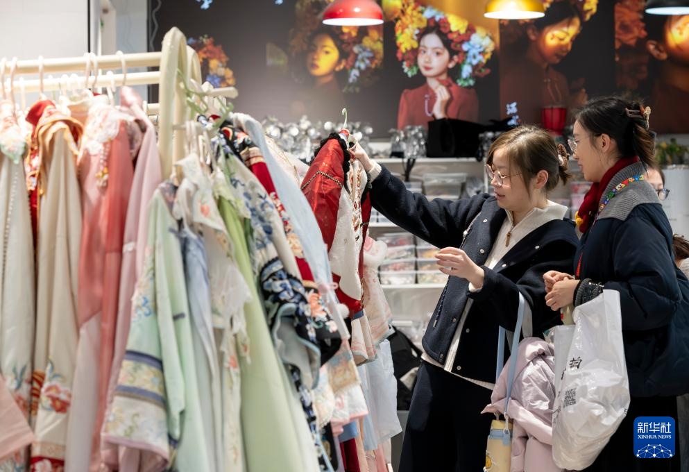 2月17日,两名游客在福州三坊七巷簪花拍摄店里挑选服装。新华社记者 魏培全 摄
