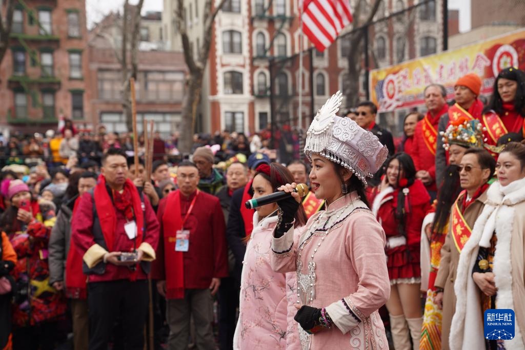 2月17日,歌手在美国纽约中国城的庙会现场演唱歌曲。新华社记者 张凤国 摄
