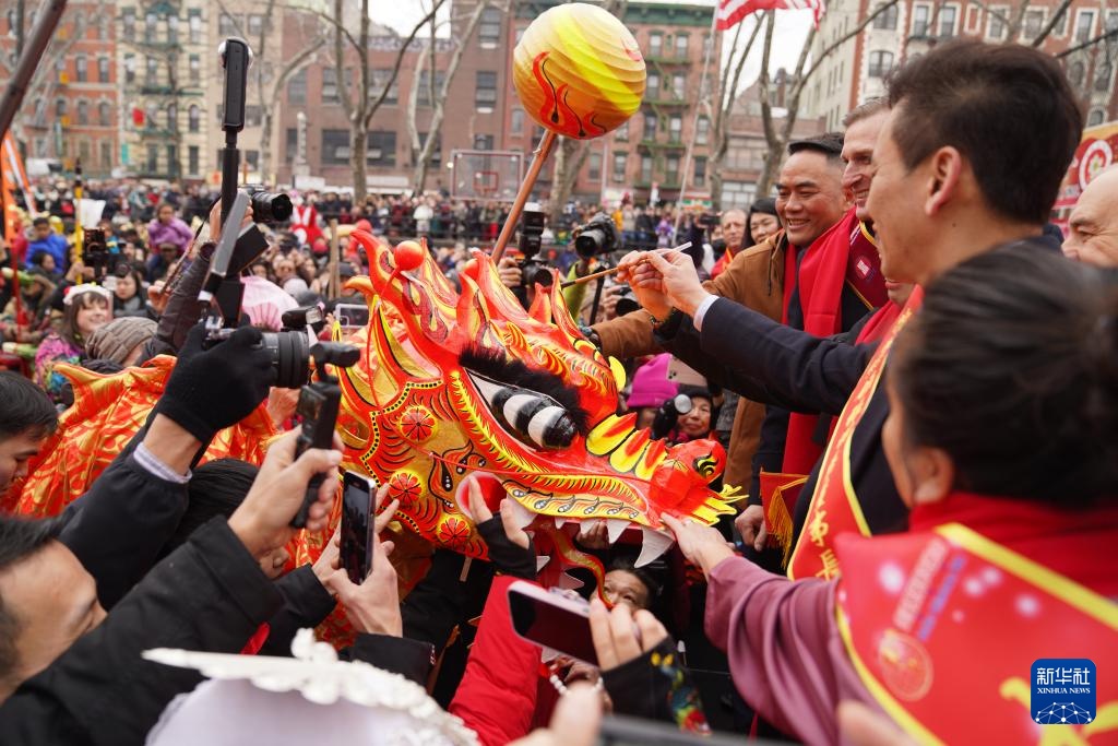 2月17日,人们在美国纽约中国城的庙会现场参加“龙头点睛”。新华社记者 张凤国 摄