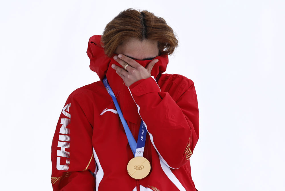 2月16日,亚军中国选手谷爱凌在自由式滑雪女子大跳台颁奖仪式后。新华社记者 张宏祥 摄