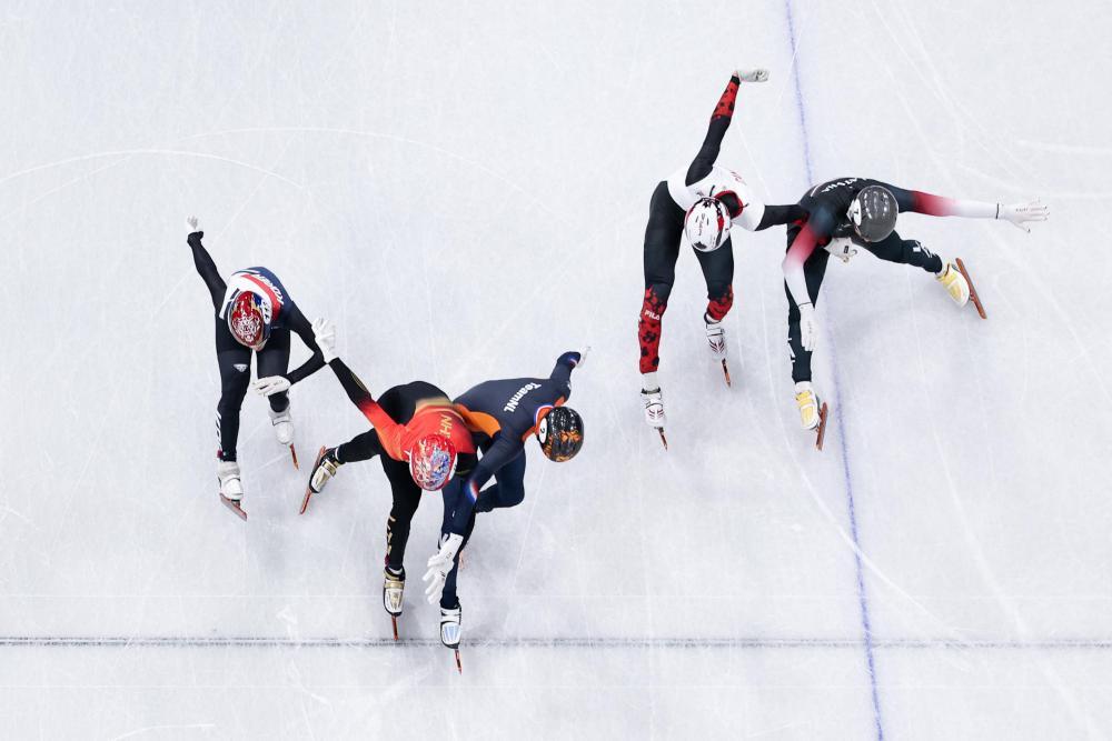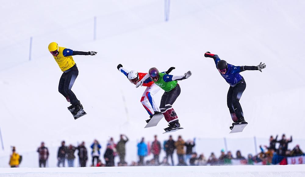 2月12日,奥地利选手雅各布·杜泽克、法国选手肖莱、加拿大选手埃利奥特·格伦丁、奥地利选手亚历山德罗·黑默勒(从左到右)在单板滑雪男子障碍追逐决赛中冲线。新华社记者 邬惠我 摄