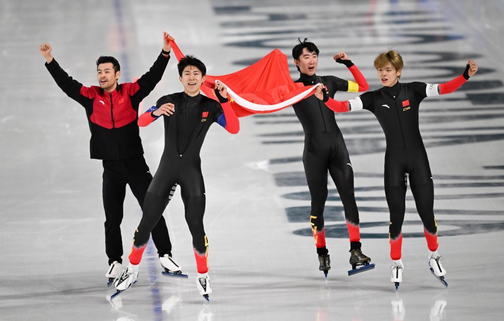 2月17日,季军中国队选手宁忠岩、李文淏、吴宇、刘瀚彬(从左至右)在速度滑冰男子团体追逐B组决赛后庆祝。新华社记者 武巍 摄
