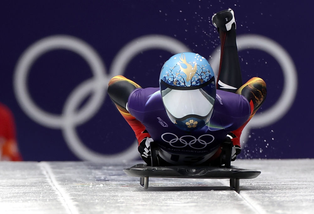 2月13日,中国选手赵丹在钢架雪车女子组第一轮比赛中出发。新华社记者 丁旭 摄