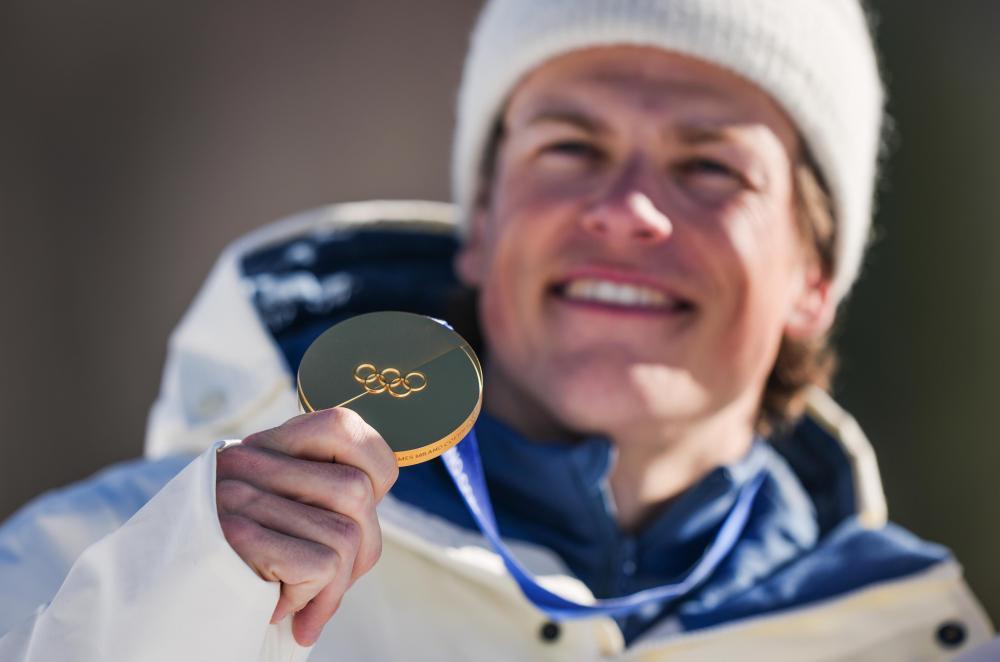 2月15日,冠军挪威队选手约翰内斯·克莱博在越野滑雪男子4X7.5公里接力颁奖仪式上。新华社记者 彭子洋 摄
